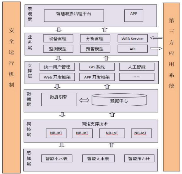 2.技术特点:融合了窄带物联网(NB-IoT)技术,具有深覆盖、广链接、低功耗、免维护、架构优等特点,可以大面积、快速地建立管网检漏模型关键节点的监测设备的部署;智慧漏损治理平台软件工艺路线采用SOA架构(service-oriented architecture)进行建设,运用大数据技术及人工智能技术进行系统建设。