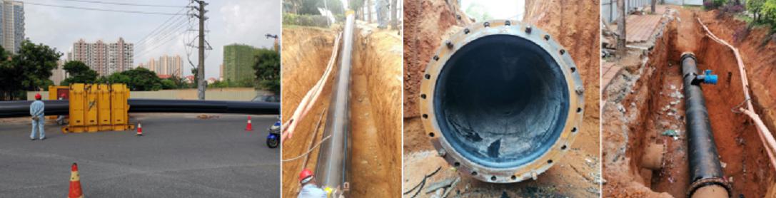 案例1:北海市主城区供水管网改造工程-银滩大道(浙江路至南海路)给水工程。该工程位于北海市银滩大道浙江路至南海路,位于城市的中心位置。建设DN800管道,全长5424m, 采用HDPE等径压缩高密度聚乙烯管穿插修复在线管道技术, 彻底解决了该城市地段供水泄露严重、水体输送污染、供水压力不足等问题。