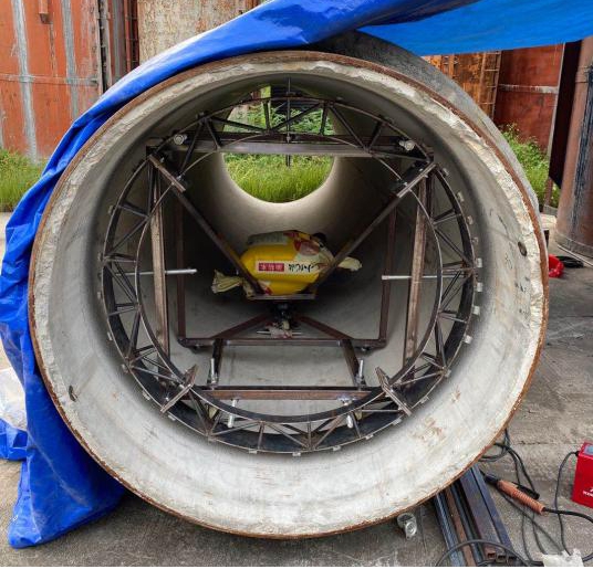 2.技术特点:该技术主要特点在于运用轻质高强预应力碳纤维板材,实现管内环向预应力加固,可应对PCCP管早期断丝、预应力不足问题,可与传统粘贴加固方式结合运用,提高结构承载内水压力能力,预防PCCP结构裂缝扩展及爆管事故发生。设备采用拼装式、模块化设计,由组合式桁架钢圈、加压气管等组成,重量轻、工艺速度快,适用于应急抢险工程。