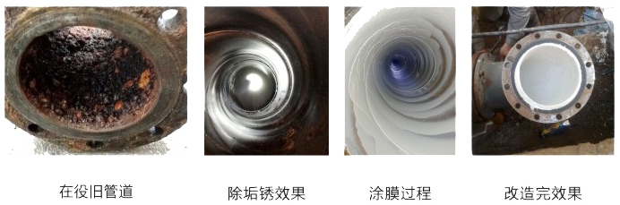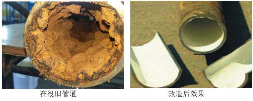 案例2:上海市区供水管道修复再造工程(建设时间2019年)。运行情况及效果:此工程为上海市浦东区东高路680号城建置业基地内的DN100变径为DN150的铸铁地埋供水管道,管道内壁有原始水泥砂浆涂层,局部腐蚀结垢较严重并有多处大小漏点。采用“旋转气流法”管道清洗修复技术对老旧管道实施非开挖修复,不但对管道高效清洗,恢复流量实现节能降耗,还对管道内壁涂膜封堵小渗漏点形成铆固形态,长效防腐延长管道的使用寿命,更重要的是用食品级的涂料对管道内壁涂膜,保障了输送水质,使直饮水的目标可以实现。