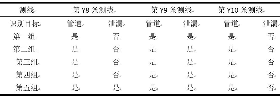案例1:应用该技术设备开展了实际埋深金属管道漏水的试验检测,五组泄漏试验的识别结果如下表所示。总体来看,管道自动识别率100%,通过选择合理的测线能有效识别泄漏位置,定位精度满意。