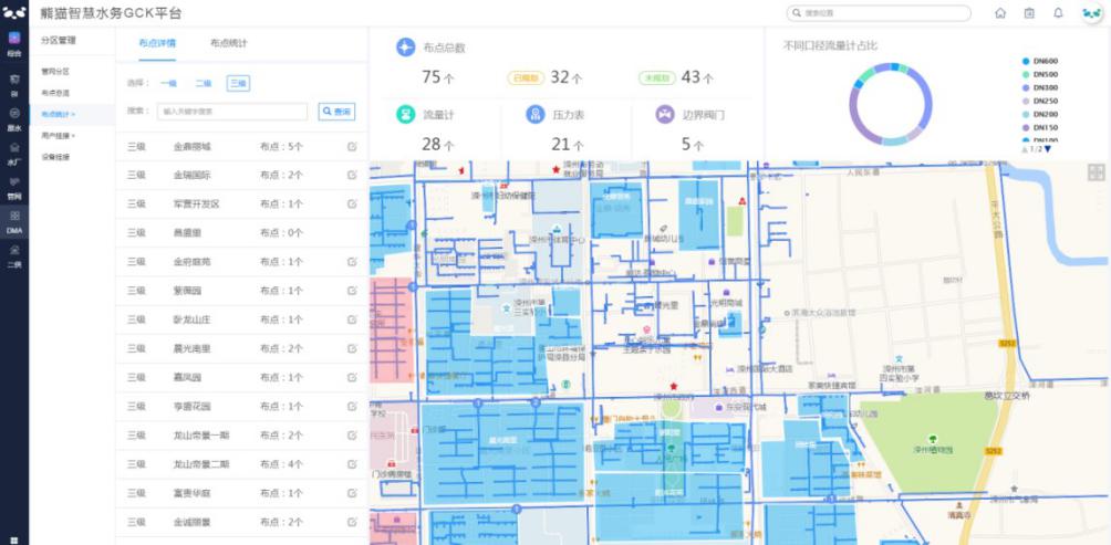 基于GIS数据,快速分析区域边界与管网的切割点,配合水流方向、切断管段的管径材质等,形成布点方案。基于大数据分析,有效预测用水量并与实际情况对比,实现异常用水的快速发现与定位。通过将整个供水系统分为多个独立计量区域,使进入该区域的流量能够准确计量,配套对应的报警方案及策略,快速确认和检测爆管和漏损的存在。通过累计流量、真实漏损计算值、营销收费水量等数据,制定科学的漏损控制策略。